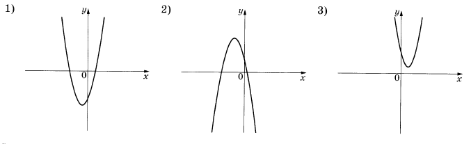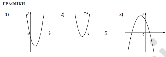 Ниже представлены графики функций вида $$y = f(x) = ax^2 + bx + c$$ и значения коэффициентов $$a$$ и $$c$$. Установите соответствие между графиками функций и значениями коэффициентов $$a$$ и $$c$$. В ответе укажите последовательность цифр, соответствующих А, Б, В, без пробелов, запятых и других разделительных символов.