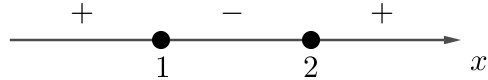 2) Поделим на $$-21$$ и меняем знак неравенства: $$(x - 1)(x - 2) \le 0.$$ Корни: $$x_1 = 1,\; x_2 = 2.$$ Отметим их на координатной прямой. Расставим знаки, которые принимает выражение $$(x - 1)(x - 2)$$ на полученных интервалах:
