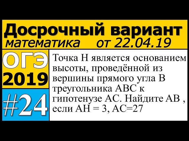 Точка $$H$$ является основанием высоты, проведённой из вершины прямого угла $$B$$ треугольника $$ABC$$ к гипотенузе $$AC$$. Найдите $$AB$$, если $$AH=3$$, $$AC=27$$.