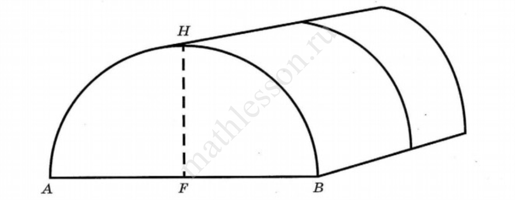 Сергей Петрович решил построить на дачном участке теплицу длиной 5 м. Для этого он сделал прямоугольный фундамент. Для каркаса теплицы Сергей Петрович заказал металлические дуги в форме полуокружностей длиной 6 м каждая и покрытие для обтяжки.