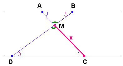 Отрезки $$AB$$ и $$DC$$ лежат на параллельных прямых, а отрезки $$AC$$ и $$BD$$ пересекаются в точке $$M$$. Найдите $$MC$$, если $$AB=18$$, $$DC=54$$, $$AC=48$$.
