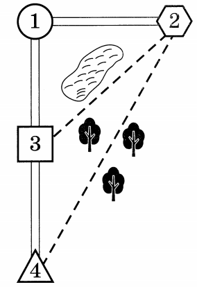 Коля летом отдыхает у дедушки и бабушки в деревне Марьевке. Коля с дедушкой собираются съездить на велосипедах в село Сосновое на железнодорожную станцию. Из Марьевки в Сосновое можно проехать по прямой лесной дорожке. Есть более длинный путь по шоссе — через деревню Николаевку до деревни Запрудье, где нужно повернуть под прямым углом направо на другое шоссе, ведущее в Сосновое. Есть и третий маршрут: в Николаевке можно свернуть на прямую тропинку, которая идёт мимо озера прямо в Сосновое. По шоссе Коля с дедушкой едут со скоростью 20 км/ч, а по лесной дорожке и тропинке 15 км/ч. Расстояние по шоссе от Марьевки ДО Николаевки равно 12 км, от Марьевки ДО Запрудья - 20 км, а от Запрудья до Соснового 15 км.