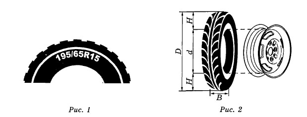 Для маркировки автомобильных шин применяется единая система обозначений. Например, $$195/65 R15$$ (рис. 1). Первое число (число $$195$$ в приведённом примере) обозначает дирину шины в миллиметрах (параметр $$B$$ на рисунке 2). Второе число (число $$65$$ в приведённом примере) - процентное отношение высоты боковины (параметр $$H$$ на рисунке 2) к ширине шины, то есть $$100 \cdot \frac{H}{B}$$.