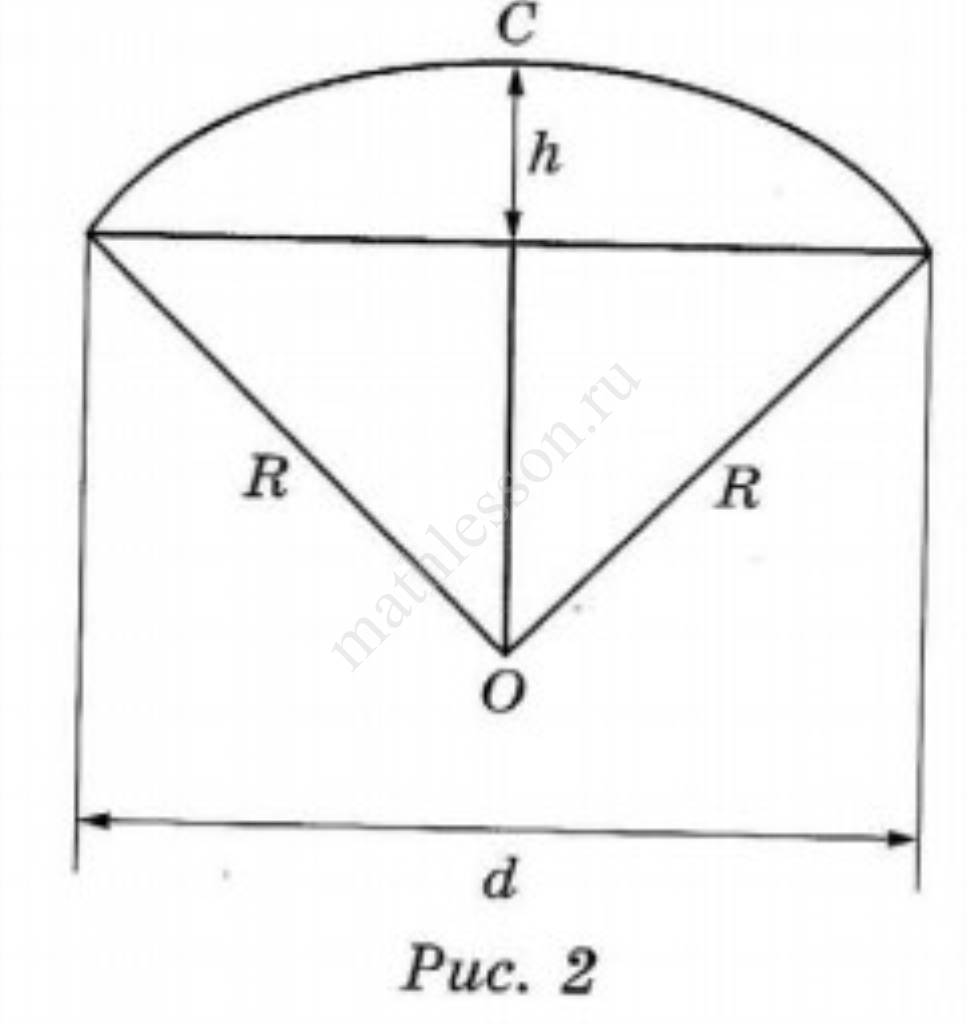 3) Боря предположил, что купол зонта имеет форму сферического сегмента. Вычислите радиус $$R$$ сферы купола, зная, что $$OC=R$$ (рис. 2). Ответ дайте в сантиметрах.