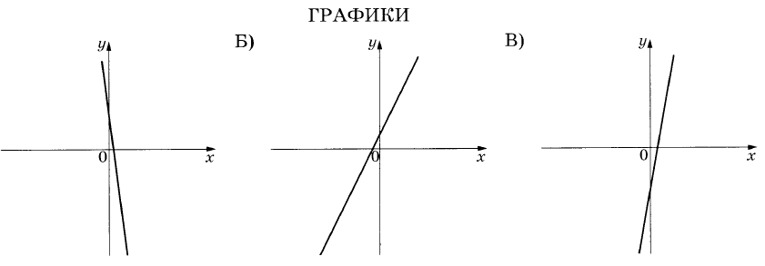 На рисунках изображены графики функций вида $$y = kx + b$$. Установите соответствие между графиками функций и знаками коэффициентов $$k$$ и $$b$$.