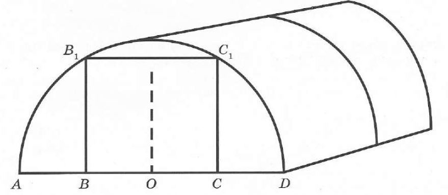 Сергей Петрович решил построить на дачном участке теплицу длиной 6 м. Для этого он сделал прямоугольный фундамент. Для каркаса теплицы Сергей Петрович заказал металлические дуги в форме полуокружностей длиной 5 м каждая и покрытие для обтяжки.