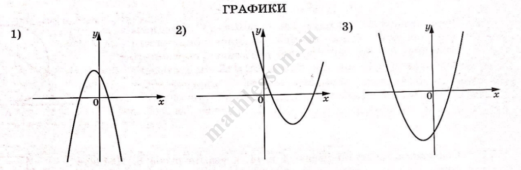 На рисунках изображены графики функций вида $$y = ax^2 + bx + c$$. Установите соответствие между знаками коэффициентов $$a$$ и $$c$$ и графиками функций.