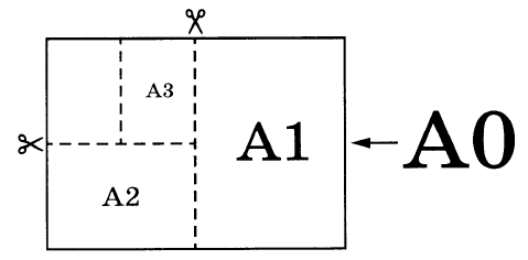 Общепринятые форматы листов бумаги обозначают буквой А и цифрой: АО, А1, А2 и так далее. Если лист формата АО разрезать пополам, получаются два листа формата А1. Если лист А1 разрезать пополам, получаются два листа формата А2 и так далее. При этом отношение длины листа к его ширине у всех форматов, обозначенных буквой А, одно и то же (то есть листы всех форматов подобны друг другу). Это сделано специально — чтобы можно было сохранить пропорции текста на листе при изменении формата бумаги (размер шрифта при этом тоже соответственно изменяется).