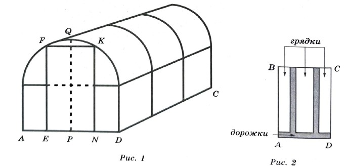 Юрий Борисович начал строить на дачном участке теплицу (рис. 1). Для этого он сделал прямоугольный фундамент длиной 6 м ( $$DC$$ на рис. 2) и шириной 2,4 м ($$AD$$ на рис. 2). Нижний ярус теплицы имеет форму прямоугольного параллелепипеда, собран из металлического профиля и по длине для прочности укреплён металлическими стойками. Высота нижнего яруса теплицы в два раза меньше ее ширины. Для верхнего яруса теплицы Юрий Борисович заказал металлические дуги в форме полуокружностей, которые крепятся к стойкам нижнего яруса. Отдельно требуется купить материал для обтяжки поверхности теплицы.