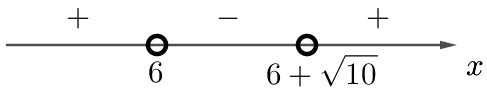 2) Найдём нули выражения: $$x_1 = 6; x_2 = 6 + \sqrt{10}.$$ Отметим их на координатной прямой. Расставим знаки, которые принимает выражение $$(x - 6)(x - 6 - \sqrt{10})$$ на полученных интервалах: