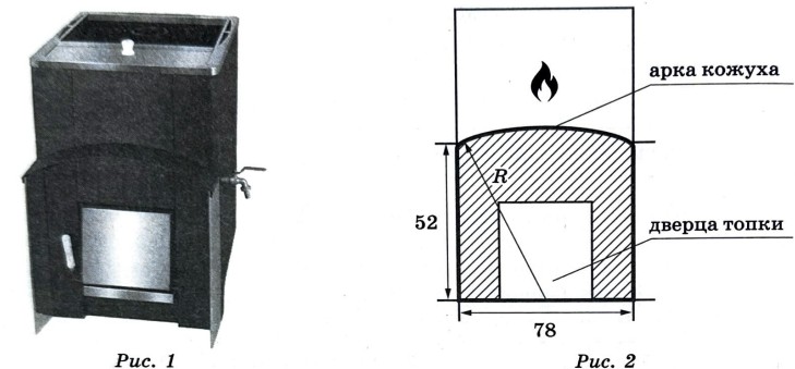 Печь снабжена кожухом вокруг дверцы топки. Верхняя часть кожуха выполнена в виде арки, приваренной к передней стенке печки по дуге окружности с центром в середине нижней части кожуха (см. рис. 2). Для установки печки хозяину понадобилось узнать радиус закругления арки $$R$$. Размеры кожуха в сантиметрах показаны на рисунке. Найдите радиус закругления арки в сантиметрах.