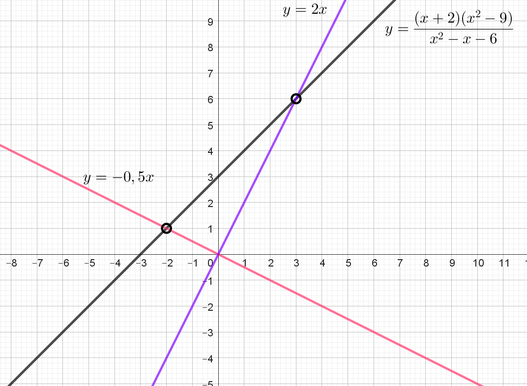 Пустые точки на графике: $$(-2; 1)$$, $$(3; 6)$$. На рисунке итоговая прямая выделена черным цветом.