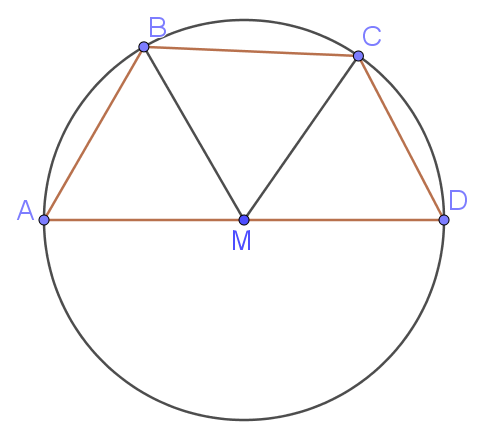 Середина $$M$$ стороны $$AD$$ выпуклого четырёхугольника $$ABCD$$ равноудалена от всех его вершин. Найдите $$BC$$, если $$AD = 12$$, а углы $$C$$ и $$D$$ четырёхугольника равны соответственно $$102^\circ$$ и $$72^\circ$$.