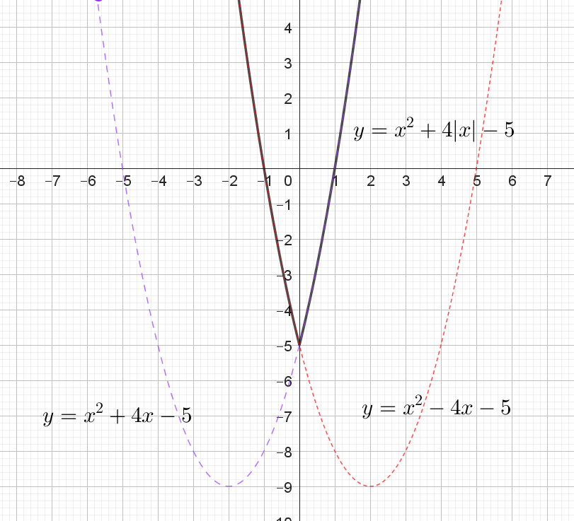 При $$x \ge 0$$: $$y = x^2 + 4x - 5.$$ (на рисунке синим пунктиром) При $$x < 0$$: $$y = x^2 - 4x - 5.$$ (на рисунке красным пунктиром)
