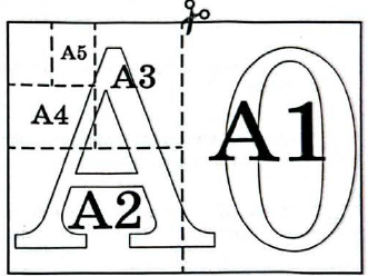 Общепринятые форматы листов бумаги обозначают буквой $$A$$ и цифрой: $$A0$$, $$A1$$, $$A2$$ и так далее. Лист формата $$A0$$ имеет форму прямоугольника, площадь которого равна $$1\ \text{кв. м}$$. Если лист формата $$A0$$ разрезать пополам параллельно меньшей стороне, получатся два одинаковых листа формата $$A1$$. Если лист $$A1$$ разрезать пополам таким же образом, получатся два листа формата $$A2$$. И так далее.