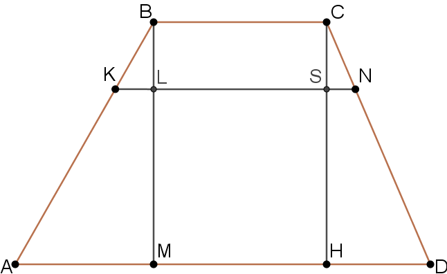 1) Проведём высоты: пусть $$CH \perp AD$$, $$BM \perp AD$$. Обозначим точки пересечения: $$CH \cap KN = S$$, $$BM \cap KN = L$$.