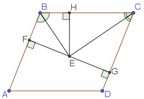 1. Опустим перпендикуляры $$EF$$, $$EH$$ и $$EG$$ из точки $$E$$ соответственно на прямые $$BC$$, $$AB$$ и $$CD$$ как показано на рисунке.
