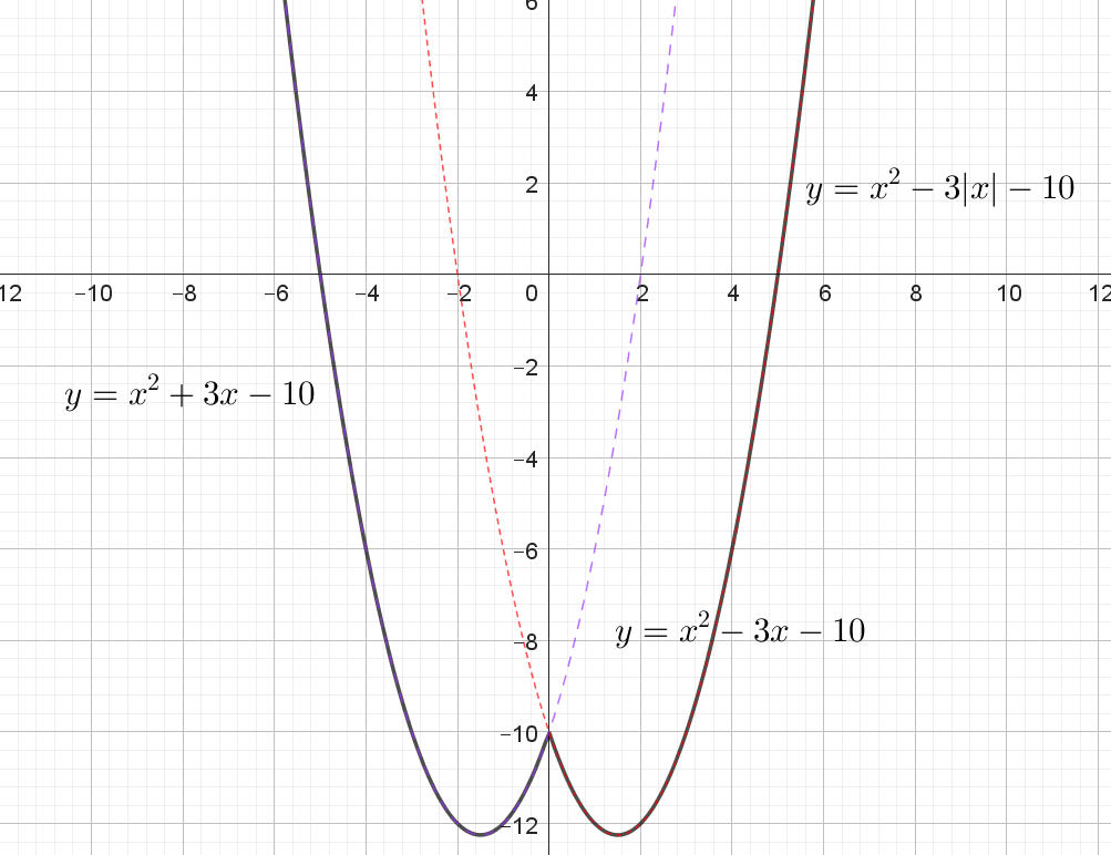 При $$x \ge 0$$: $$y = x^2 - 3x - 10.$$ (красный пунктир) При $$x < 0$$: $$y = x^2 + 3x - 10$$ (синий пунктир).